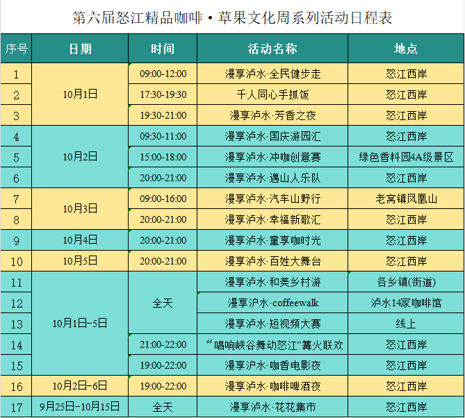 据介绍,怒江州第六届怒江精品咖啡·草果文化周将于10月1日至6日在泸水市盛大启幕。期间,将推出“咖啡·草果文化秀”,举办一系列精彩活动,包括漫享泸水·全民健身走、千人同心手抓饭、漫享泸水·芳香之夜、漫享泸水·冲咖创意赛、漫享泸水·汽车山野行、无人机表演、烟花秀、篝火晚会等,共有文艺演出、咖啡主题、户外探险、文化体验等板块的20余场活动。