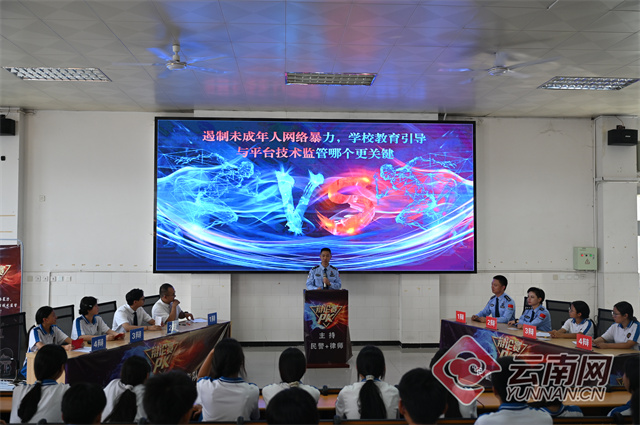 今年5月,一场由泸水市六库镇中学和花桥坝边境检查站联合举办的模拟法庭“校园预防网暴”辩论成了广大师生中的热门话题。“民警+学生”和“律师+学生”就“预防网暴需要治心还是治技”展开了辩论。“民警+学生”方以“学校通过心理干预,网暴率降低37%”为依据,强调德育在校园预防网暴中的核心作用,而“律师+学生”方则通过“某短视频平台通过人工智能识别拦截不良信息2.1亿条”,来表明技术防控的精准优势。