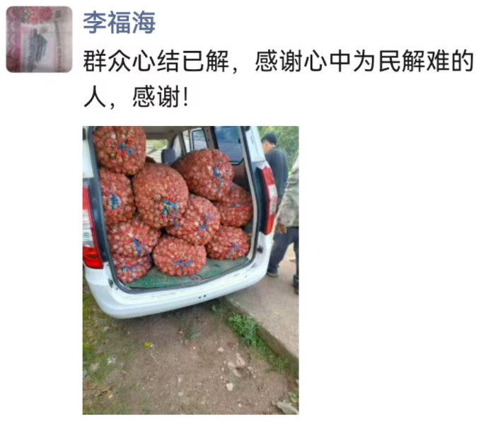 “我家卖1000多斤,收入4000多元,真的太感谢我们村干部了!” 听着微信到账的声音,村民李福海脸上的愁容早已被笑容取代,激动地发朋友圈向村干部道谢。
