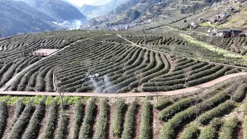云南西部,怒江大峡谷的晨雾中,福贡县布拉底村千亩茶园里,大疆农业植保无人机正沿着预设航线施肥,机翼掠过之处,茶芽在阳光下泛着鲜绿光泽。“无人机一天能作业近千亩。这是经过土壤改良后升级的富硒茶园,产值将比之前提升几十倍!”福贡县硒元素茶业有限公司负责人唐双荣一脸欣喜地说。
