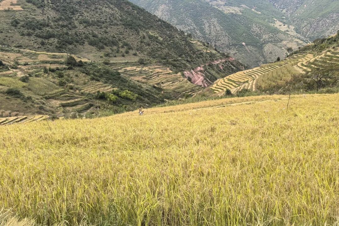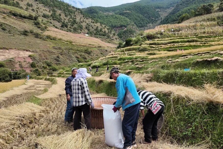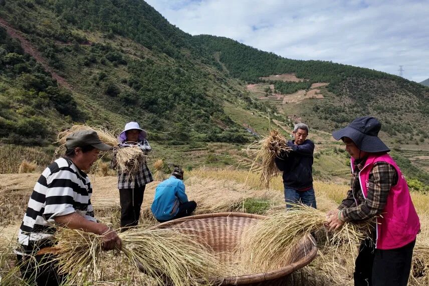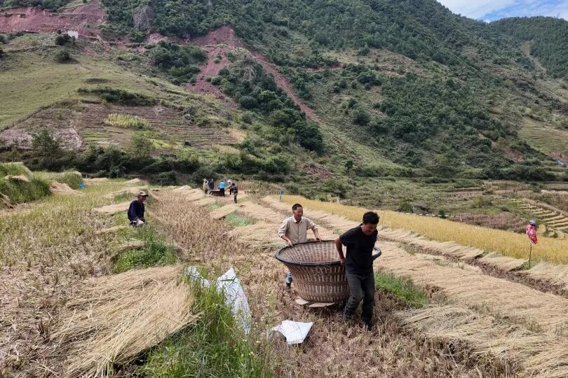 金秋时节,兰坪县啦井镇九龙村一片热闹景象。五月里村民弯腰插下的秧苗,历经数月生长,迎来了丰收季。沉甸甸的稻穗为山坡披上了金灿灿的“外衣”,奏响了丰收的欢歌。