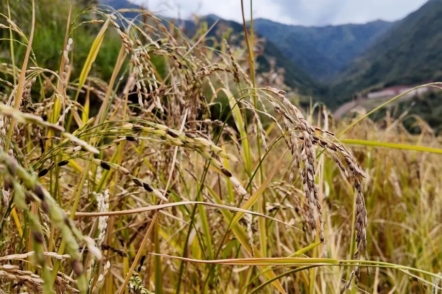 梯田顺着山势蜿蜒,微风拂过田间,稻谷轻轻摇曳,宛如金色的海浪翻涌,“沙沙”的声响伴着稻香在山间弥漫。沉甸甸的稻穗压弯了腰,在阳光下泛着光泽,蕴藏着一整年的好光景。