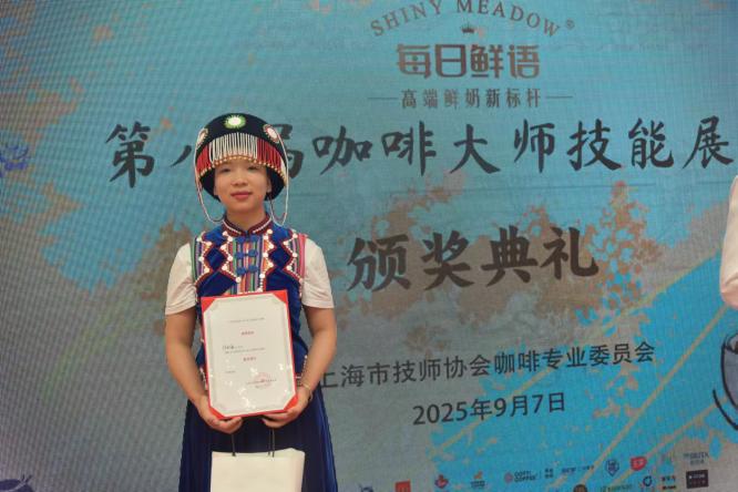 带着这份匠心与创新,何丽梅一步步走向更广阔的赛场。2025年9月,上海第八届咖啡师大赛的舞台上,何丽梅制作了一杯以云南优质咖啡豆为基底,融入怒江老窝苹果的清甜、兰坪石榴的醇厚,再点缀少许桂花的芬芳的名为“霓影啡语”的特调咖啡,让她成功获得优秀奖。同年,她顺利通过高级咖啡师资格认证,此前更连续三年以优异成绩通过咖啡训练营考核。
