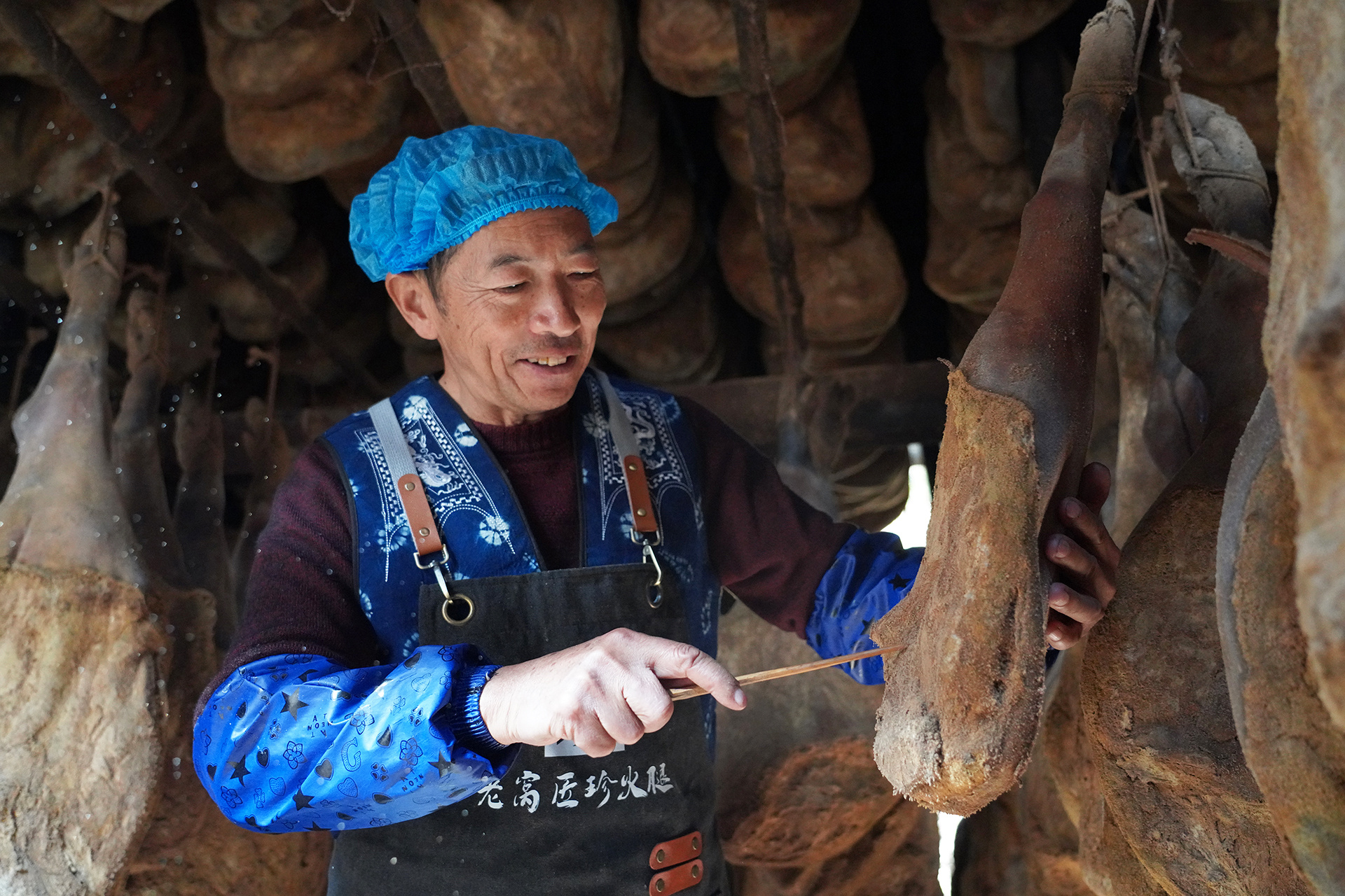 老窝火腿的腌制工序繁杂且考究,从选腿、修腿、洒酒、上盐、揉腿,到悬挂风干、烟熏烘烤、发酵陈化,每一个环节都凝聚着匠人的匠心。杨李忠深耕火腿腌制技艺20余载,始终坚守传统工艺,对品质精益求精。这份执着坚守换来了累累硕果:2022年12月,老窝火腿制作技艺成功入选云南省非物质文化遗产代表性项目名录;2025年,他的“匠珍火腿”作坊顺利申报为泸水市第二批非遗工坊,成为传承非遗技艺、带动群众增收的重要平台。