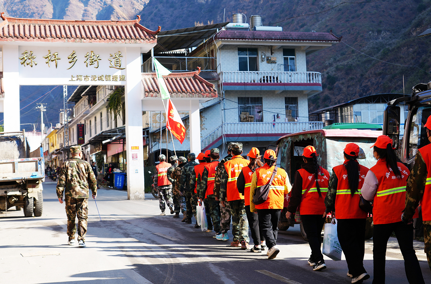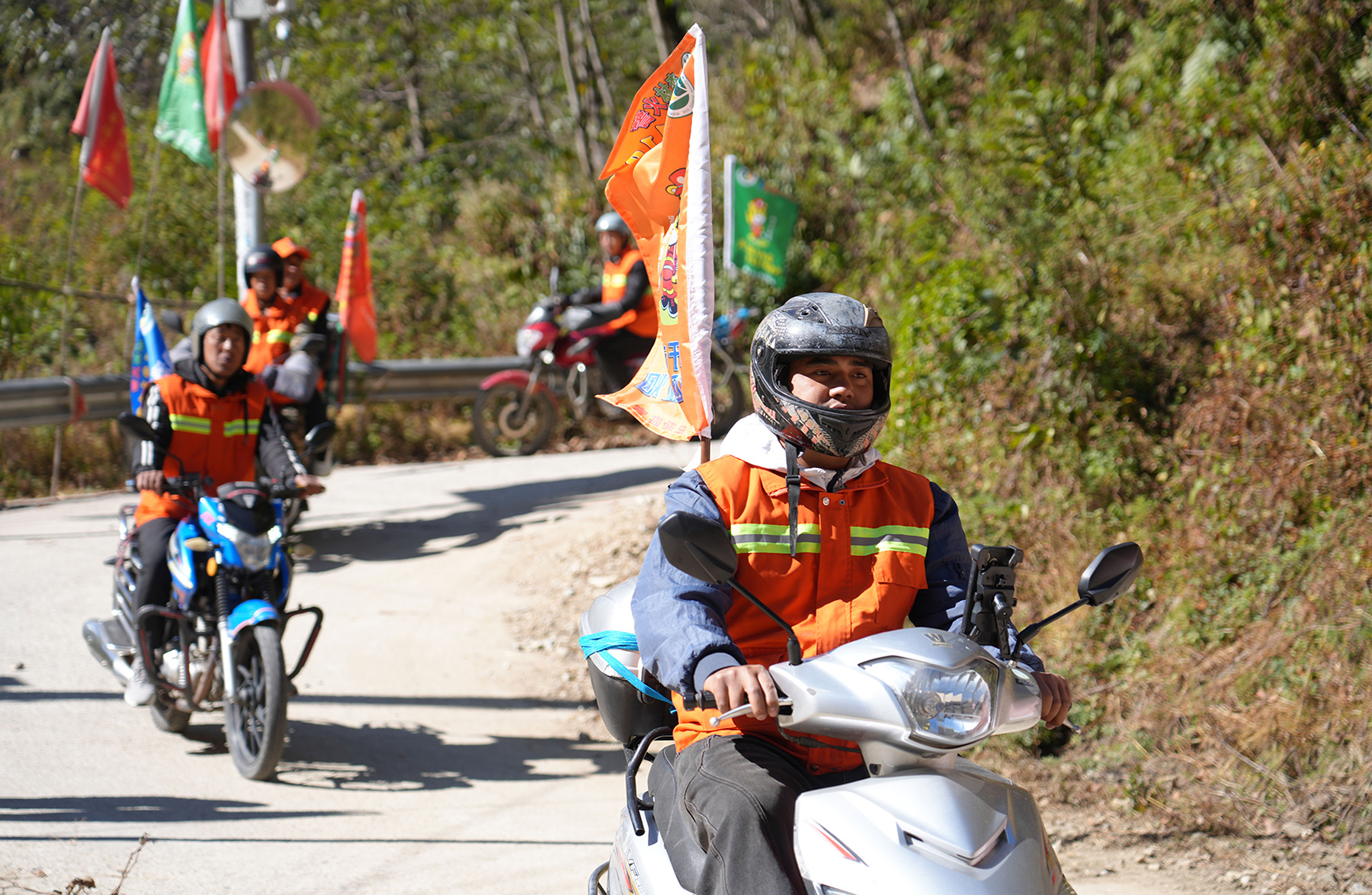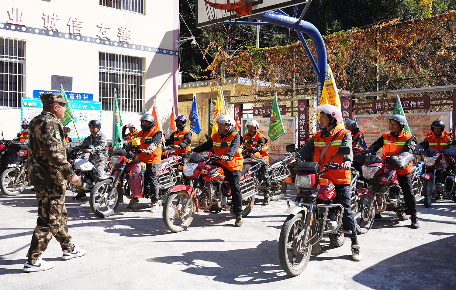 记者跟随工作人员抵达称杆乡勒墨村时,该村负责人正清点巡逻人数,巡逻队伍排列整齐、精神抖擞,身后数十辆摩托车有序停放,车身绑挂的“森林防火”标识彩旗迎风招展,成为山间一道醒目的风景线。