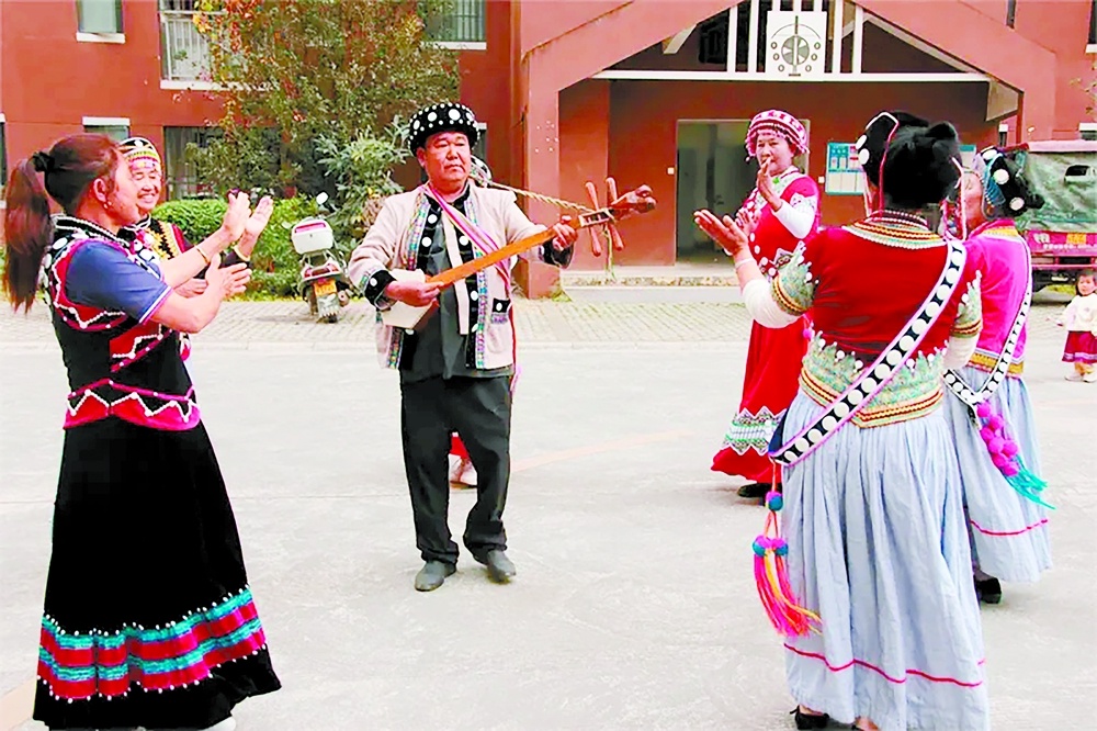 搬迁之前,和加全一家生活在兰坪县营盘镇拉古山村的山上。初到社区,语言、生活习惯的差异,让他一度感到不适应。为尽快融入新家园,也出于对傈僳族民歌“摆时”的热爱,和加全积极响应社区组建文艺队伍的倡议,带头成立了沧江文艺队,开始了每日晚饭后的“摆时”活动。“一开始只有几位兰坪老乡参加,后来,白族、怒族等喜欢民歌的居民也加入了进来,慢慢就开始热闹了。”和加全说。