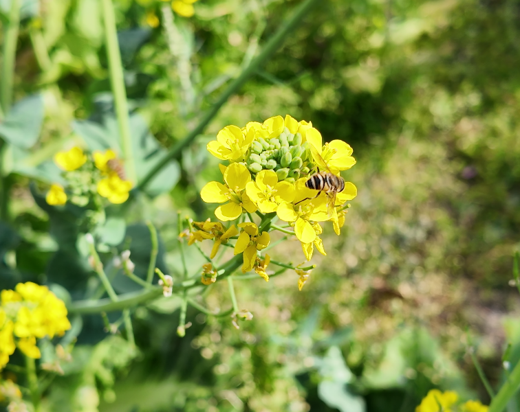 阳光之下,每一朵油菜花都舒展着花瓣,吸足了春的养分,绽放得热烈而坦荡。微风吹过,花浪翻滚,香气裹挟着泥土的清新扑面而来,引得蜂群穿梭其间,嗡嗡的声响与花瓣的轻颤交织,成了春日里最鲜活的乐章。
