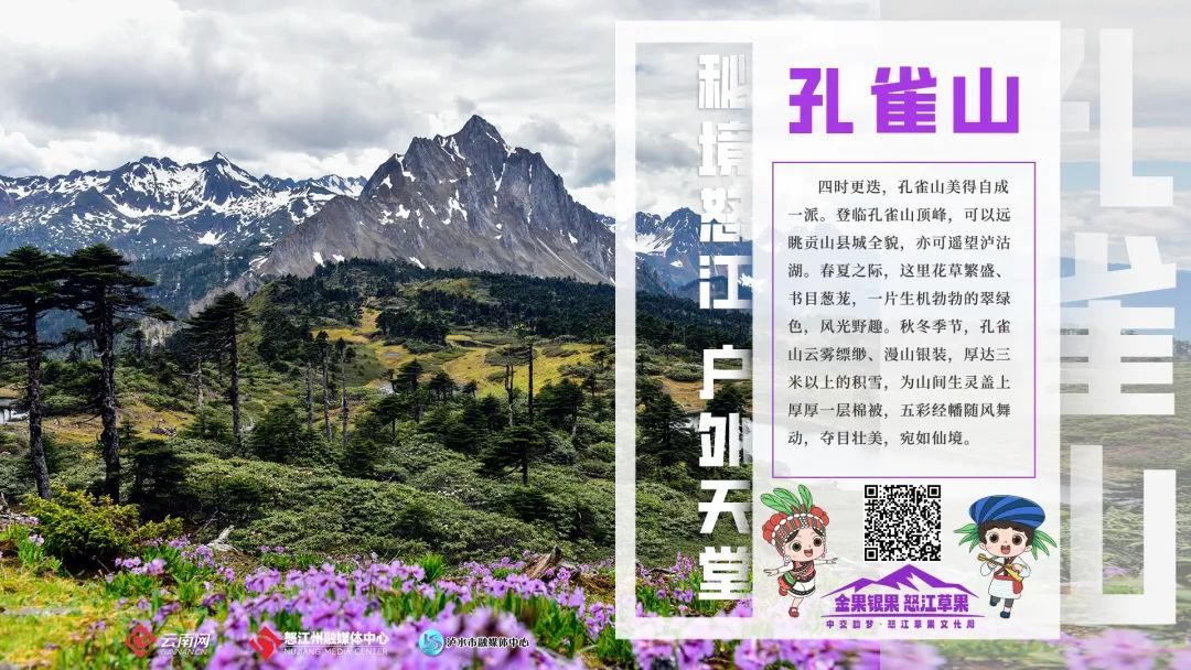 四时更迭,孔雀山美得自成一派。登临孔雀山顶峰,可以远眺贡山县城全貌,亦可遥望泸沽湖。春夏之际,这里花草繁盛、书目葱茏,一片生机勃勃的翠绿色,风光野趣。秋冬季节,孔雀山云雾缥缈、漫山银装,厚达三米以上的积雪,为山间生灵盖上厚厚一层棉被,五彩经幡随风舞动,夺目壮美,宛如仙境。