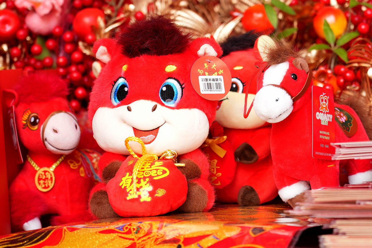 除了传统对联与“福”字,创意类春节饰品同样备受青睐。温暖绵软的小马玩偶、印着“马上有钱”“大吉大利”的压岁红包、造型精致的马年挂饰销量可观,兼具观赏性与寓意感,成为市民装点家居的新选择。