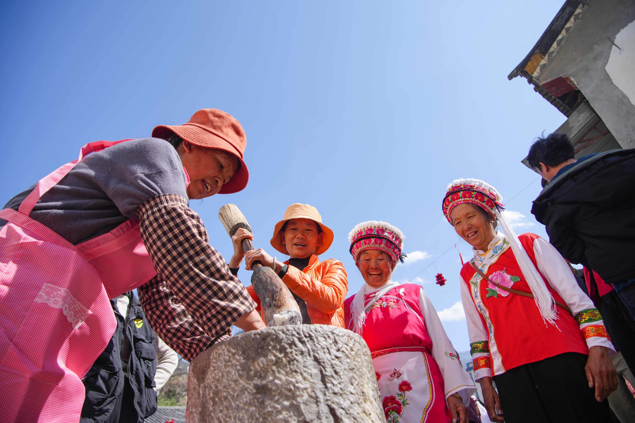 舂粑粑的现场年味十足,石臼声声、糯香弥漫,大人小孩轮番上阵,在欢声笑语里感受地道白族年俗。村民何跃菊双手紧握木杵,用力捶打着石臼中的糯米。不多时,软糯香甜的粑粑新鲜出臼。她用芭蕉叶细心包裹,热情递给远道而来的游客品尝。